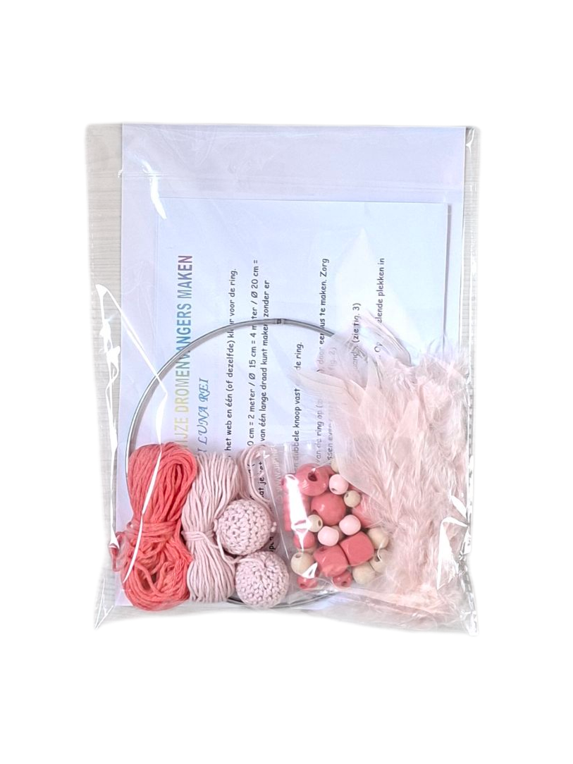 Creapakket voor het zelf maken van een donkerroze dromenvanger, met roze, lichtroze en lichte houten kralen, 2 met lichtroze omgehaakte houten kralen en lichtroze veertjes. De doorsnede van de ring is 15 cm.