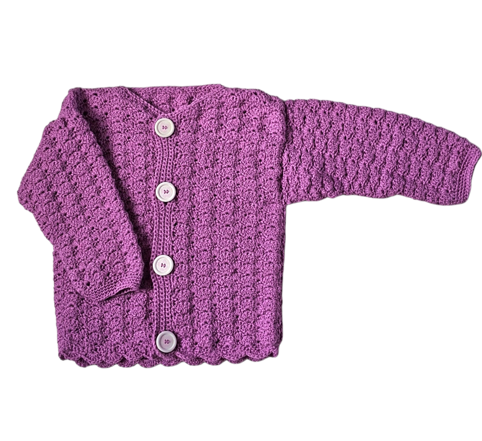 Superzacht paars gehaakt meisjesvestje, met witte houten knopen met een lila vlindertje. Dit vintage gehaakte vestje is gehaakt van zachte paarse acrylwol.