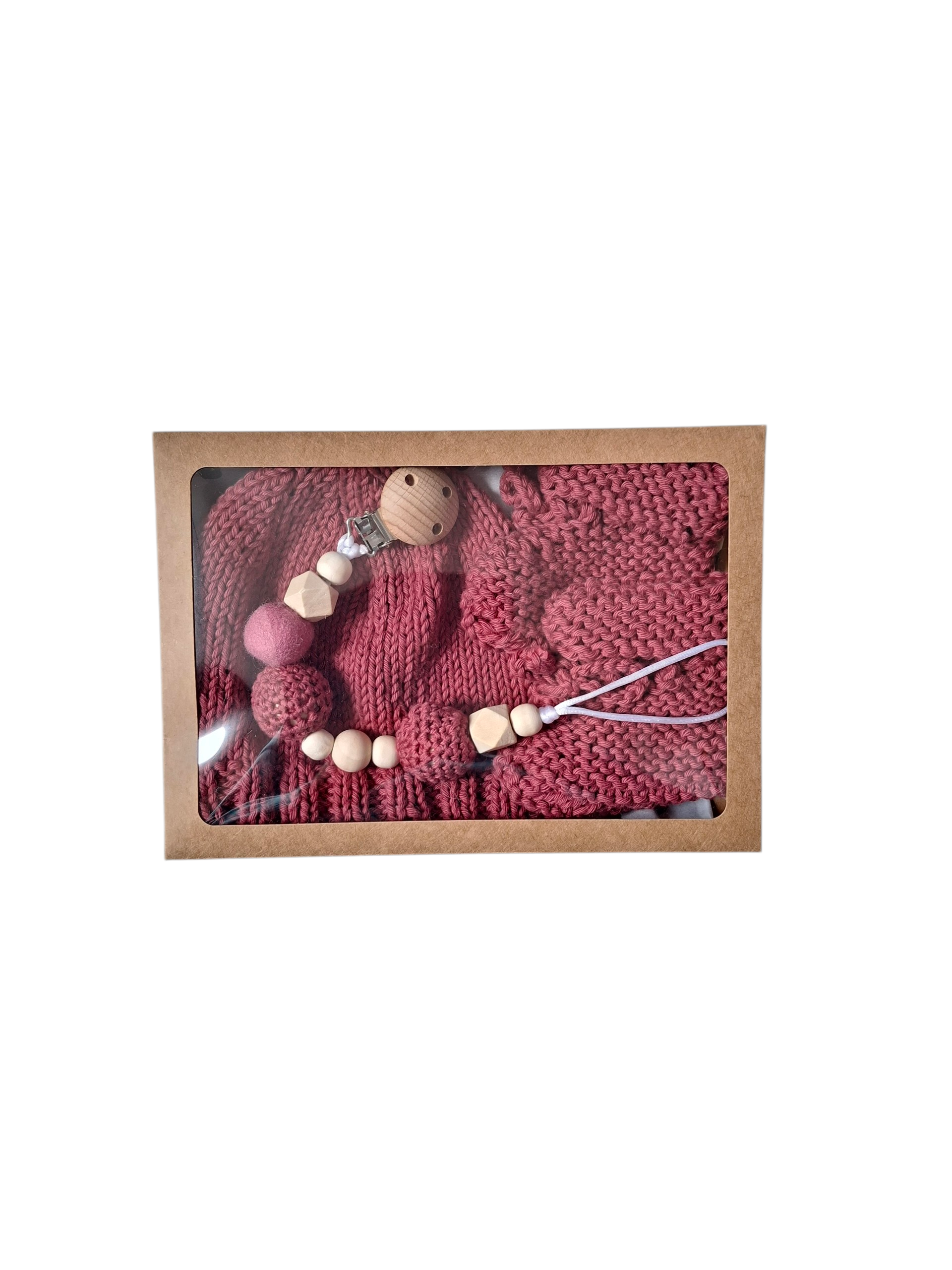 De babygiftset bevat een pruim gebreid katoenen mutsje met bijpassende comfortabele katoenen slofjes, met een koordje, voor heerlijk warme voetjes. Om het newborn-setje compleet te maken is er een bijpassend speenkoord in pruim, met een duurzame kwaliteit houten kralen.