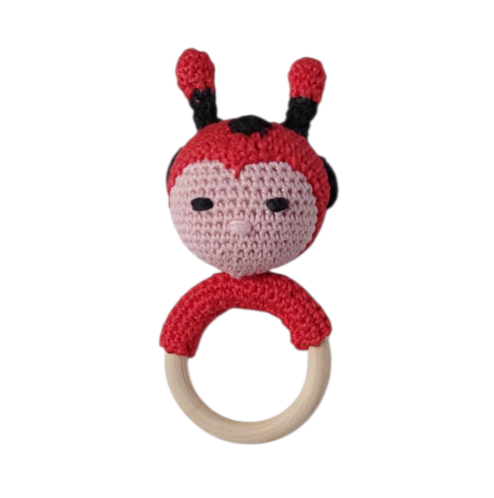 Deze rammelaar met lieveheersbeestje is gemaakt van 100% katoen en gevuld met een zachte fiber vulling. Er is een rammelschijf in verwerkt, voor een fijn geluidseffect. De houten ring van 7 cm doorsnede is van onbehandeld beukenhout en daardoor geschikt voor kinderen van 0 – 9 maanden.
